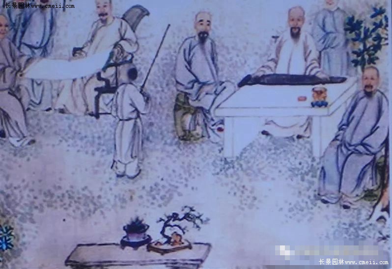 6.王維為什么要在盆中放一塊對蘭蕙的生長盛衰沒有任何關系的石頭呢?更值得人們深思的是馮摯在記述文字中沒有使用“置”、“放”、“擺”、“擱”等常用字,而選用了一個讓人頗感意外的“養”字。有人不禁要問:本無生命特征的石頭怎么能“養”呢?唯一的答案只能是,身為唐代大詩人、大畫家、大音樂家的王維,在將自己的繪畫經驗和“詩言志”、“詩緣情而發”的詩歌創作理念以及音樂的節奏、節拍、旋律、和聲、曲式等藝術特性和理論等借鑒于盆景創作以后,作為盆景的基本表現元素、本無生命的石頭,就產生了一種奇妙的蛻變。于是,在王維眼中,這塊本無生命的綺石,驟然間華麗轉身為一塊擬人化的有生命的“活石”了。而把這樣一塊“活石”“養”起來,也就變得合情合理了。這塊綺石不僅對盆景營構畫面起到了烘托、渲染的作用,更重要的是它滿足了創作者對心理情感、意志品質、社會人生乃至宇宙精神的訴求。可以毫不夸張地說,王維的盆景“養以綺石”,是中國盆景史上一項前無古人、無與倫比的偉大創舉。中國盆景從此有了各種配件的廣泛應用,有了藝術意境的創作追求,有了詩情畫意的審美境界。更為重要的是王維的這一創舉,對確立中國盆景的藝術地位,起到了至關重要的催化、支撐和穩固的作用。王維的“養以綺石”還歷史性地開創和規范了中國盆景的基本表現模式,即石與植物的組合。王維的這種盆景模式,受到后世文人特別是文化精英們的熱切關注和大力推崇。如施耐庵就曾在其名著《水滸傳》(第81回)中專門寫過宋代的松石盆景:浪子燕青拜訪京師名妓李師師,“入到客位前,見周回吊掛名賢書畫。階檐下放著三二十盆怪石蒼松。”而元畫家李士行的《偃松圖》以及清葉芳林、方士庻的《九日行庵文燕圖》(圖4)等,畫的都是樹與石結合的盆景。再看看當代中國盆景,其表現形式豐富多彩,而樹與石組合的盆景更是琳瑯滿目。不管是以樹為主兼以體量很小的單體點綴石組成的盆景,還是以石頭為主兼以樹木為輔的山水盆景、樹附石(圖5)盆景,抑或是石、樹所占比例相差不大甚至幾乎均分的水旱盆景、樹石盆景(圖6)等等,無不是王維盆景制作理念、方法、模式的延續和拓展。已故著名中國盆景藝術大師賀淦蓀先生提出的“樹石盆景”概念及其高足、中國盆景藝術大師張志剛君所著《中國樹石盆景》一書的文化源頭和理論根據,就在這里。
