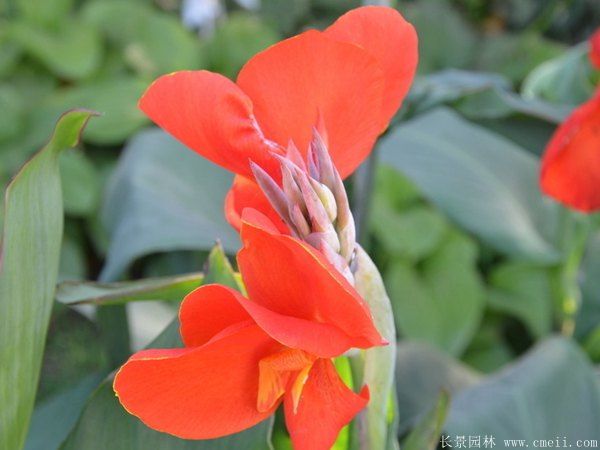 美人蕉又名蘭蕉,是園林中常見的多年生球根,直立草本園林苗木,株高0.5~3m,植株無毛,美人蕉有粗壯的莖,夏秋季節開花,花色有紅色、黃色、白色等,原產印度,在我國有華南、華東有普遍栽植,是美化環境不可缺少的觀花植物。品種有近千種,常見的有大花美人蕉、紫葉美人蕉、雙色美人蕉。美人蕉根莖粗壯肥大,單桿直立生長,不分叉,葉子互生,寬大、長橢圓形。在吉林、北京、四川、江西、山東、河南、山西、安徽等地栽植表現良好,北方地區6~10月開花,南方全年開花。大花美人蕉喜歡溫暖濕潤的陽光充足的環境,不耐寒,北方地區冬季地面部分會枯死,翌年新春重新長出新芽,為防止凍死種根,在冬季來臨前做好防凍準備,可在地面鋪蓋稻草秸稈等御寒。喜歡肥沃深厚的土壤,排水生長期經常施肥,也可作為盆栽觀花植物。